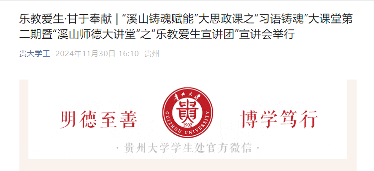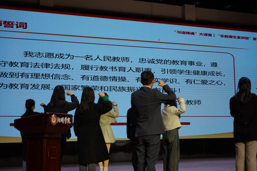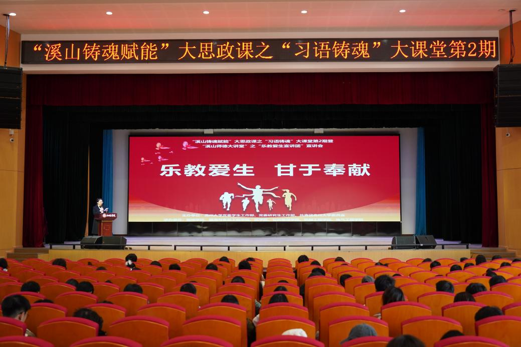 2024年11月28日,“乐教爱生·甘于奉献”——“溪山铸魂赋能”大思政课之“习语铸魂”大课堂第二期暨“溪山师德大讲堂”之“乐教爱生宣讲团”宣讲会在南校区大礼堂举行。此次活动由党委学生工作部、党委研究生工作部、共青团yl6809永利官网委员会联合主办,阳明学院、公共管理学院、电气工程学院、机械工程学院、酿酒与食品工程学院、医学院联合承办。来自各学院的300余名学生代表参加活动。活动由阳明学院辅导员刘欢主持。