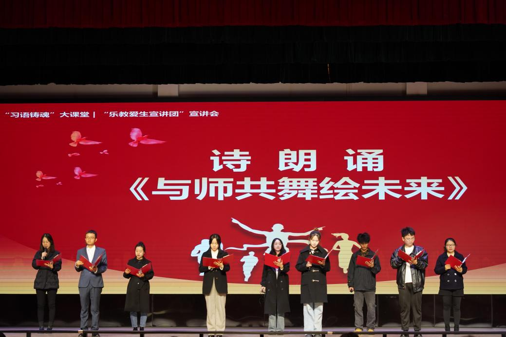 活动尾声,公共管理学院辅导员胡蓉老师,电气工程学院辅导员王晶晶老师,酿酒与食品工程学院辅导员楚勤方老师、王正选老师,法学院本科生梁嘉欣,以及参与宣讲的学生代表谢玉方、刘张益、刘崇连共同朗诵现代诗《与师共舞绘未来》,为我们描绘了一幅教师与学生共同奋斗、共同成长的温馨画卷。