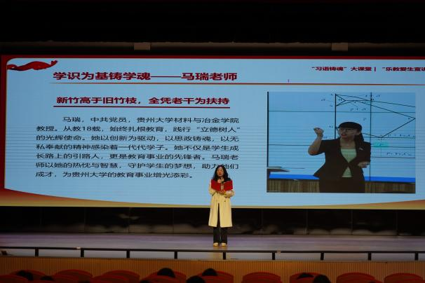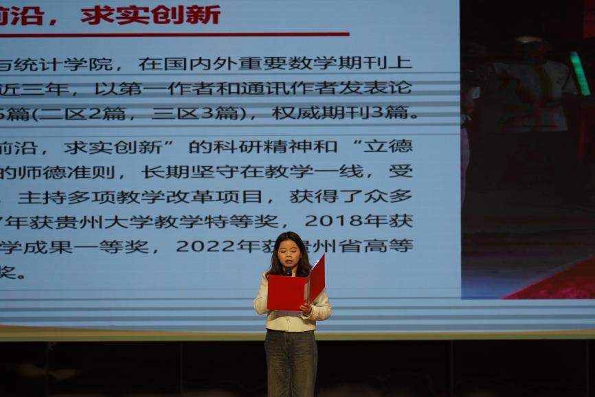 阳明学院辅导员颜志敏老师、哲学学院研究生张岚芬、酿酒与食品工程学院本科生魏楚桓分享了2024年yl6809永利官网最美教师彭定涛老师、马瑞老师、余压芳老师的故事。老师们钻研学术、巩固学识,带领学生追求真理,展现了学识为基铸学魂的崇高精神。来自阳明学院的同学们朗诵儒家经典《劝学》,激励贵大学子从古文中汲取智慧,认识到学习的重要性,以学为乐,以知为荣,以正确的态度和方法去学习。