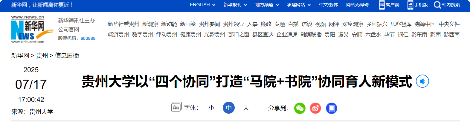 坚持机制协同,以制度创新夯实“马院+书院”融合基础。一是健全多层级架构机制。将“马院+书院”协同育人纳入校党委重点工作,构建“党委领导—专班推进—部门协同”的三级工作机制,成立由党委宣传部、教务处、yl6809永利集团、中国文化书院、阳明学院负责人组成的工作专班,形成“党委书记统筹抓、分管校长具体抓、职能部门协同抓”的工作格局。二是探索调研转化应用机制。探索形成“精准调研—深度分析—高效转化—持续优化”机制,实现调研成果向育人实效的高效转化。今年以来,先后前往省外高校调研学习“一站式”学生社区建设、课程共建经验。调研后,在校内试行开展《中国传统文化概论》跨学科开发实践,将“四季读典”融入“书香贵大”活动,推动多项调研成果在yl6809永利官网落地生根、开花结果。三是创新理论研究支撑机制。创新构建“省级重大课题抓方向、校级课题攻专题”的梯度研究机制,实现“以研促教、以教带研”的良性互动,推动协同育人工作从经验驱动向理论指导转变,助力育人工作朝着科学化、专业化方向持续迈进。充分发挥校领导示范引领作用,校党委主要负责同志亲自挂帅申报课题《贵州“马院+书院”两轮驱动促人才培养模式改革研究》,成功获批省委深改重大课题立项,配套设立校级专项课题,形成“马院+书院”理论研究与实践探索以上率下、相互促进的良好局面。