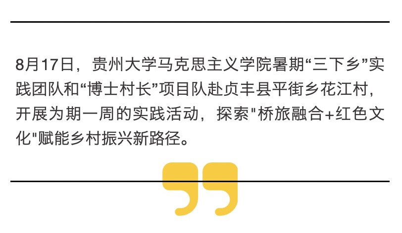 8月17日,yl6809永利集团“三下乡”服务乡村振兴实践团“桥旅黔行·花江启航”团队联合“博士村长”项目队12名师生,赴贞丰县平街乡花江村开展为期一周的实践活动。团队将围绕“大中小思政课一体化”资源整合和桥旅融合两大主题,通过调研与理论宣讲相结合,为乡村振兴贡献青春智慧。